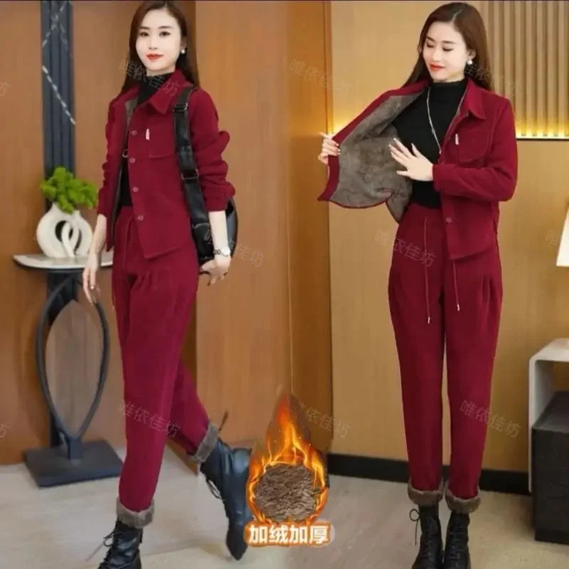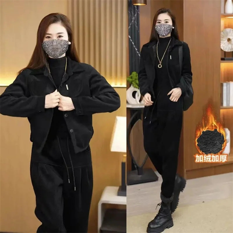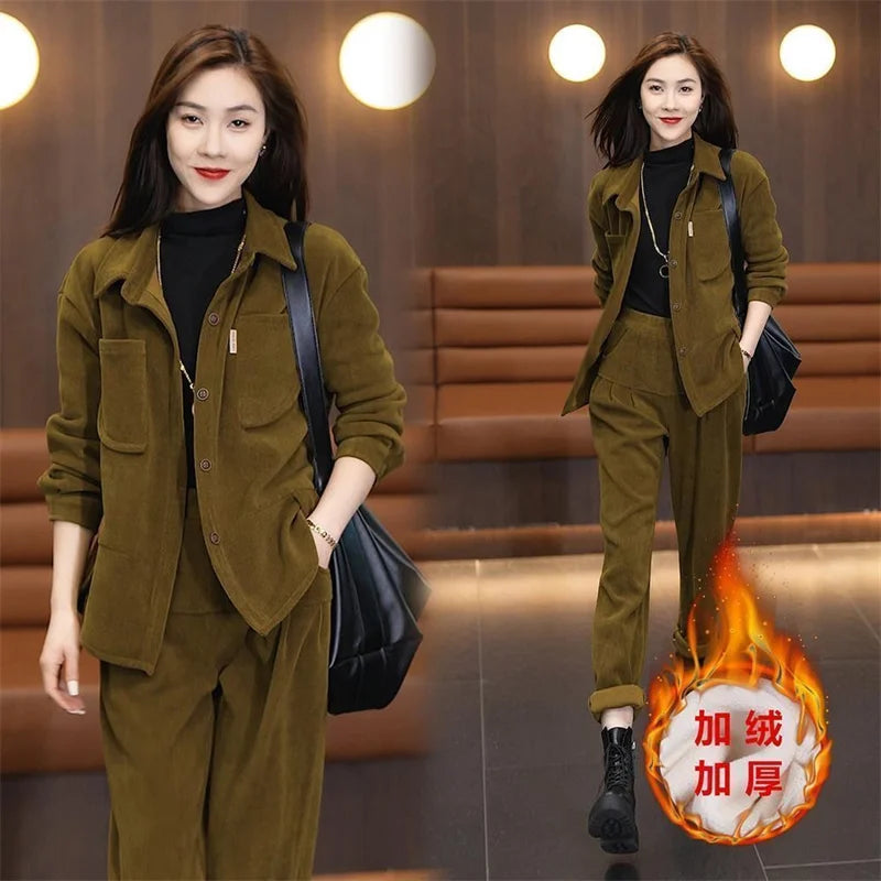 Bring effortless style to your wardrobe with this Corduroy Two-Piece Set, blending casual comfort with a polished look. This versatile set includes a loose-fit jacket with a turn-down collar, front buttons, and practical pockets, paired with high-waisted harem-style trousers featuring an elastic waistband for all-day ease. Made from soft corduroy with a slight stretch, this set is perfect for all seasons, offering both comfort and understated elegance.