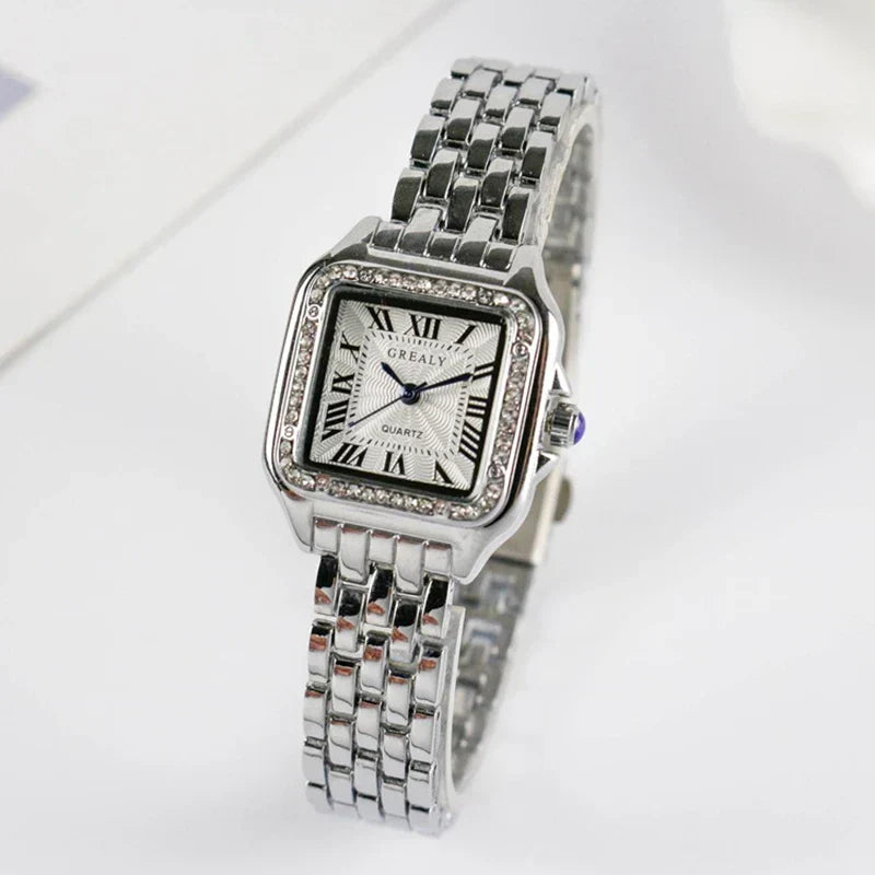 Classic square wristwatch with a silver steel band. Features a minimalist quartz movement design for timeless elegance.