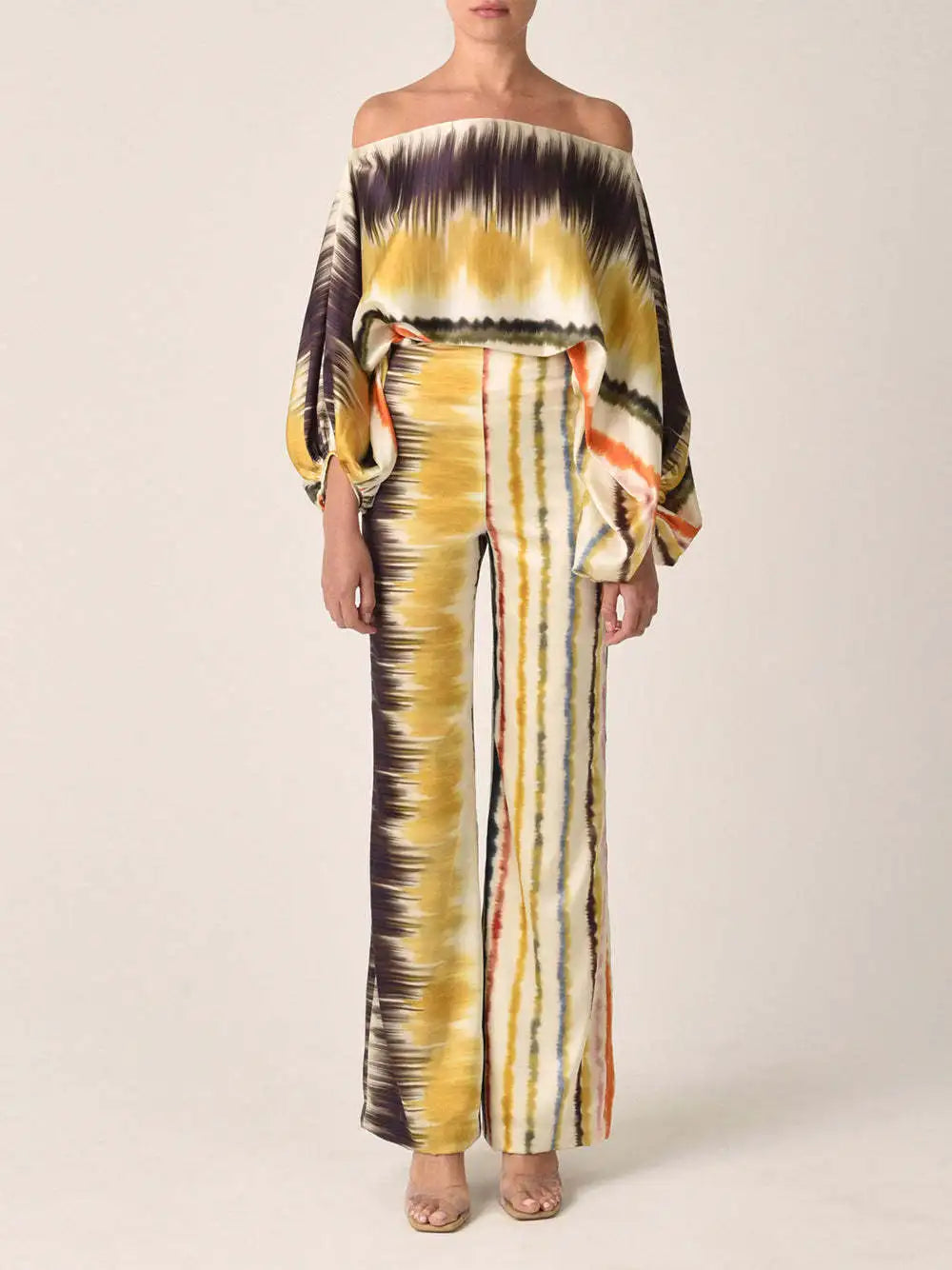 • Top: Off-shoulder blouse with wrist-length sleeves and loose fit.